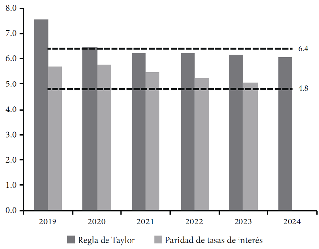 Con base en los mecanismos de transmisión de la Figura 1 y las proyecciones de nuestro modelo SES, se puede observar que la tasa de política monetaria (la TIIE) se encontrará muy por encima de la neutral durante el periodo 2019-2024, lo que permitiría que el Banco de México tuviera una postura de política monetaria más expansiva. De hecho, de acuerdo con nuestras proyecciones, la tasa de política monetaria podría bajar hasta 100 puntos base durante el periodo de estudio (véase el Cuadro 2), dado que las brechas de inflación y producto se reducirán pronto. Los resultados reflejan que el Banco de México tiene espacio para disminuir su tasa de referencia hasta que su valor iguale a la tasa neutral (6.45%), que es compatible con el producto potencial y la inflación de equilibrio. En este contexto, si la tasa de política monetaria no se reduce, el Banco de México estará propiciando una mayor contracción y un proceso deflacionario.