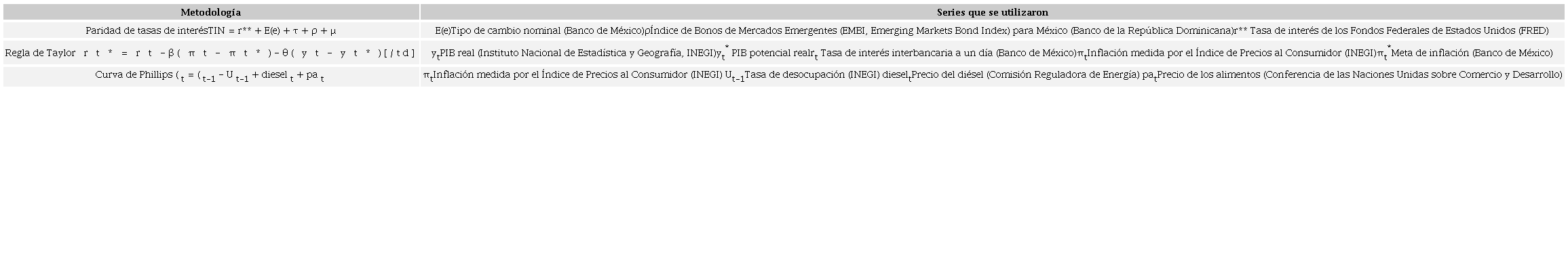 El modelo SES también contiene las variables necesarias para determinar la tasa de interés neutral nominal de acuerdo con las metodologías de la paridad de tasas de interés y la regla de Taylor, así como los determinantes de la curva de Phillips para la economía mexicana. El Cuadro 1 resume algunas de las variables empleadas para estimar la tasa de interés neutral y la inflación dentro del SES.