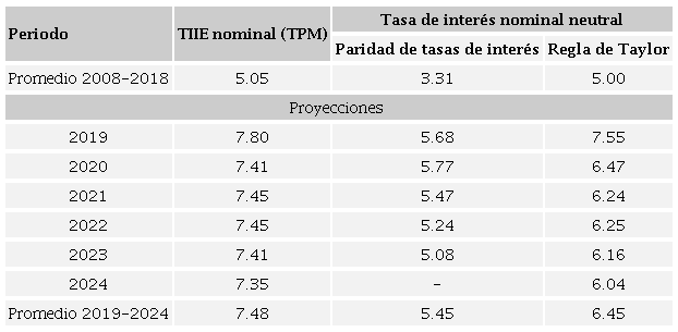 En el Cuadro 2 se reportan también los resultados de la tasa nominal neutral obtenidos mediante el enfoque de la paridad de tasas de interés.2 Esta última metodología sugiere que la tasa de interés nominal neutral debería ser aún más baja en ese periodo, lo cual significa que la posible postura de la política monetaria en los próximos años debería ser un poco más flexible.