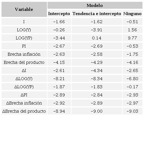La estimación de la tasa de interés neutral con la regla de Taylor parte de la ecuación [2], . Mediante algunos cálculos se obtiene la ecuación [4], que describe la tasa de interés neutral nominal de largo plazo (Sánchez, 2016, p. 9), donde rt es la TPM, () es la brecha de inflación obtenida como la diferencia entre la inflación y la meta de inflación, () es la brecha del producto estimada como la desviación del producto respecto al producto potencial; se calcula mediante el filtro Hodrick-Prescott con λ igual a 1 600. Con el fin de emplear series estacionarias y obtener resultados confiables se reescribió la regla de Taylor como un modelo ECM debido a que sus determinantes son de orden de integración I(1) y cointegran. En el Anexo se presentan las pruebas estadísticas de raíces unitarias de las variables utilizadas en la regla de Taylor.