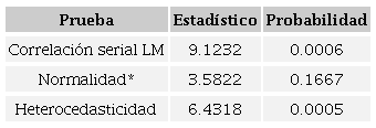 Como se explicó previamente, los modelos ECM permiten capturar la dependencia y las características determinísticas de las series (Mills, 2019, p. 233), lo cual coadyuva en la simulación y pronósticos de los datos. Para que lo anterior ocurra debe realizarse una batería de pruebas de correcta especificación, así como simulaciones dentro y fuera de la muestra para evaluar la capacidad de predicción del SES.