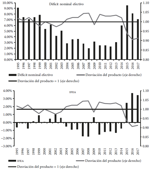 En 1999, de 2001 a 2003, 2009 y de 2015 a 2017, la producción estuvo por debajo de la media del ciclo y el IFEA fue negativo. Esta desaceleración fue más severa en el periodo 2015-2017: en promedio un producto efectivo total ocho puntos porcentuales menor que el producto medio para el periodo (indicador de desviación del producto igual a 0.92 en promedio), con el impacto positivo de los estabilizadores automáticos, siendo el más grande de la serie (3.20% del PIB total, en promedio). Por lo tanto, se deduce que la crisis económica de este periodo tuvo un gran impacto en el nivel de actividad económica y, en consecuencia, en el resultado fiscal efectivo.