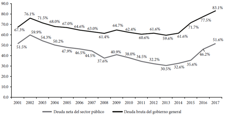 Sin embargo, a partir de 2015, aunque todavía se obtuvieron superávits primarios estructurales, hubo déficits primarios efectivos, lo que contribuyó al aumento de la relación deuda pública/PIB bruta y neta, de 61.6% y 32.6% en 2014 a 83.1% y 51.6% en 2017 respectivamente. Por lo tanto, en el último periodo, los superávits primarios estructurales fueron positivos, pero insuficientes para garantizar la estabilización de la relación deuda pública/PIB, dado el peso de los intereses de la deuda y el fuerte impacto fiscal de los estabilizadores automáticos durante la recesión.