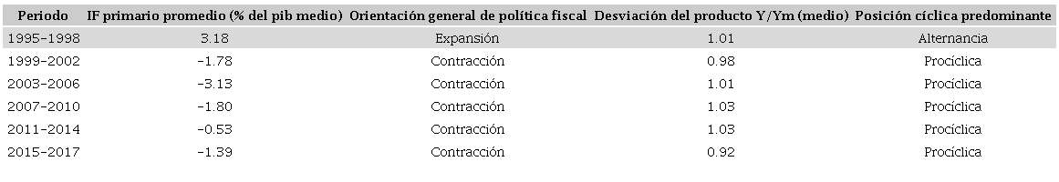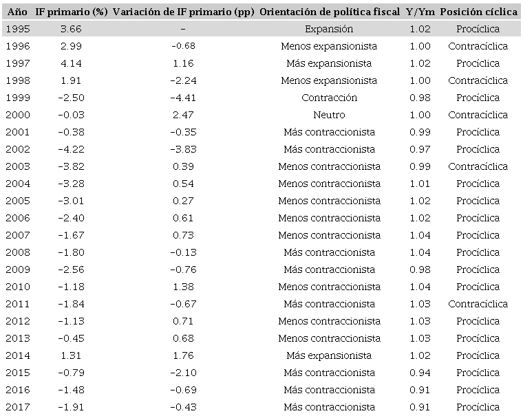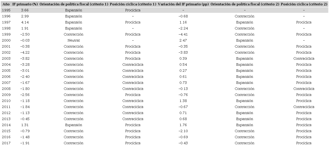 Respecto a la posición en relación con el ciclo económico, según el criterio 1, predominaba la postura procíclica en 1995, 2003 y de 2014 a 2017, y una postura predominantemente anticíclica entre 2004 y 2013 (excepto 2009). Pero, según el criterio 2, existe un predominio de la postura procíclica en casi todo el periodo analizado, excepto en 2003, 2008 y 2011.