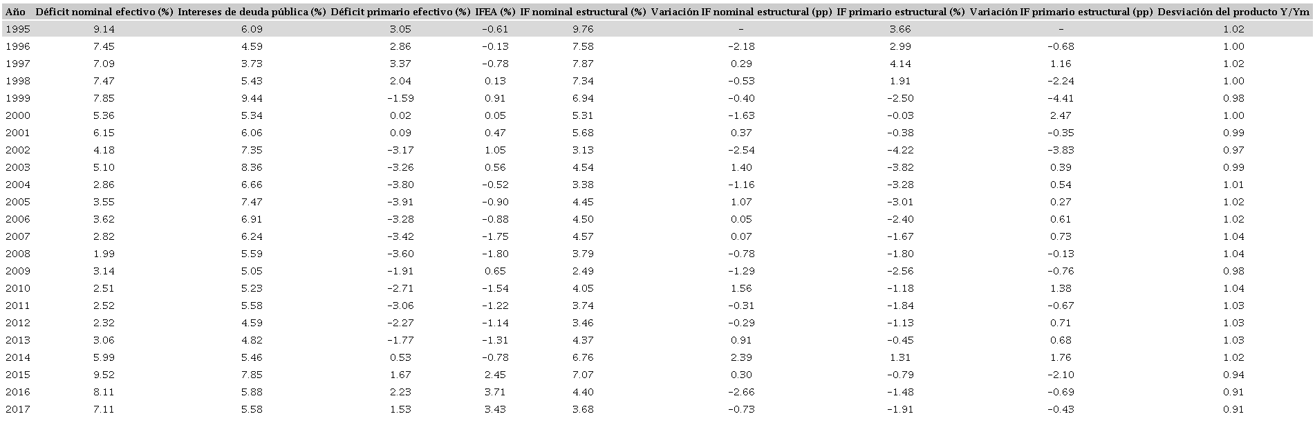 Entre 1999 y 2017 (excepto 2014) hubo superávit primario estructural, por lo que podemos concluir que los déficits fiscales primarios efectivos en los años de este periodo se debieron al funcionamiento de los estabilizadores fiscales automáticos, que fueron fuertemente activados como resultado de la recesión económica (2015-2017). También significa que el déficit fiscal efectivo tiende a reducirse por la actuación de los mecanismos fiscales automáticos a medida que la economía vuelve a crecer.