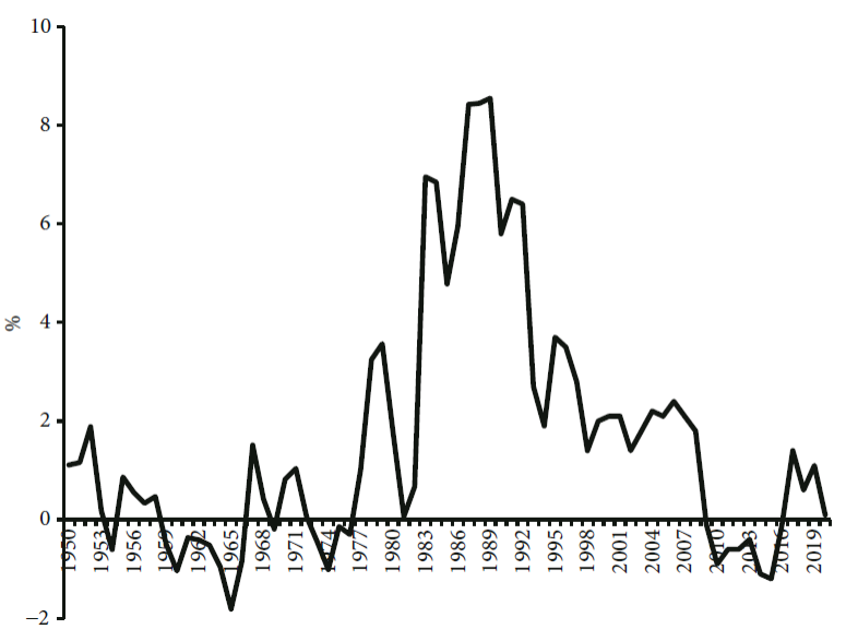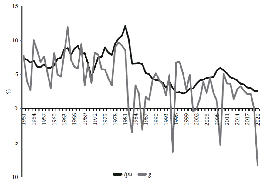 The substantial reduction of Ipu has negatively affected the growth rate of the economy (g) (see Figure 7). It is also worth noting that Ip did not decrease with the fall of Ipu, but it increased more than the absolute decrease of Ipu, in such a way that the annual average of the total investment as a percentage of GDP was higher from 1982 to 2020 (20.2%) than from 1951 to 1981 (18.1%). However, beyond debating the existence or non-existence of a crowding-out effect, the productivity of investment was lower with the restructuring of I in favor of Ip6.