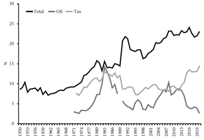 According to Figure 2, from 1950 to 2020, public revenues as a percentage of GDP (pr) exhibited an increasing tendency, being the tax revenues as a percentage of GDP (tr) their most important source. Oil revenues were relevant from the last years of the seventies to the last years of the eighties during the last century and during the first decade of the current century, but oil revenues are very volatile, and in some periods (from 2014 on) are not significant. The importance of the size of the government depends strongly on tr. The problem is that although tr has been increasing since 2012, the Mexican economy is one of the Latin American upper-middle countries with the lowest tax effort (see Table 1).