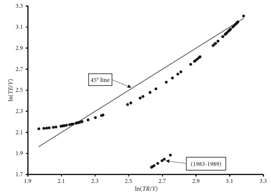 According to our results, pe behaves as a quadratic function of pr. As can be seen in Figure 3, our estimation is consistent with the idea of pr acting as a pe constraint. Except for the 1983-1989 subperiod in which pe was strongly decreased to cover debt and debt services, the estimated long-run equation generally indicates a lower value, although not significantly different, of pe with respect to pr.