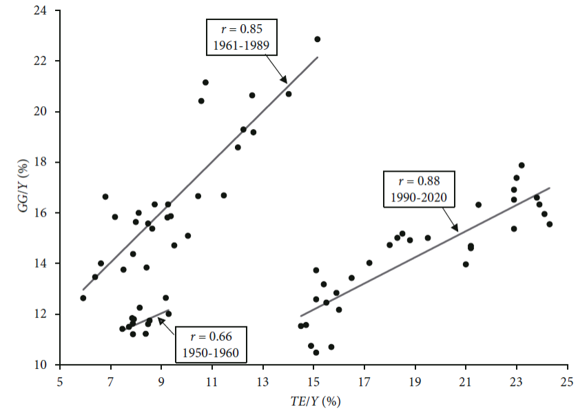 As it is known, public expenditure can be registered in two accounts, the public balance and the national account. Given that the issues registered in both accounts are not the same, it is worth noting that there is a strong relationship between the total public expenditure registered in the public balance (PE) and the total public expenditure recorded in the national accounts (GG). From 1950 to 1960, the correlation coefficient between pe and GG as a percentage of GDP (gg) was equal to 0.66; from 1961 to 1989, it was equal to 0.85, and from 1990 to 2020, it was equal to 0.88 (see Figure 4). Therefore, pr is not only a constraint for pe but so is also for gg.