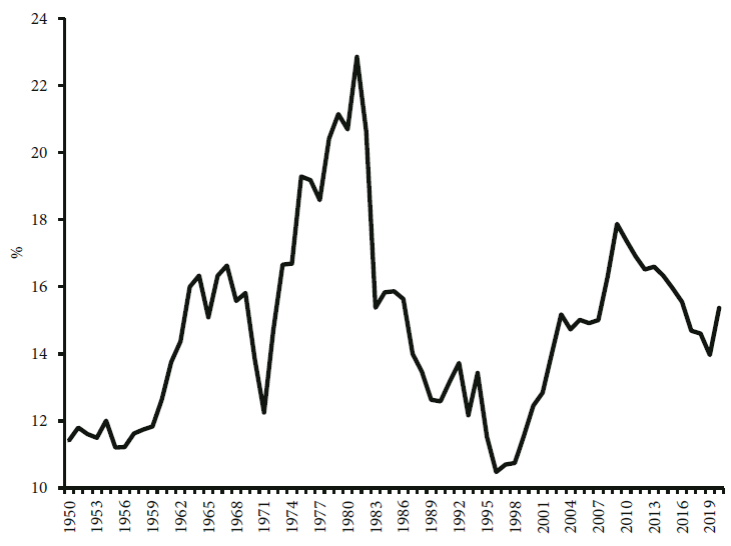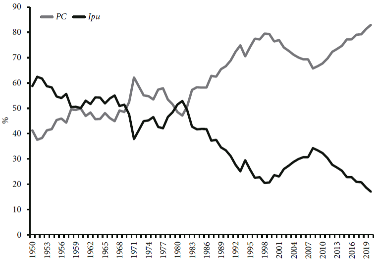 According to Figure 5, from 1950 to 1981 gg doubled, from 11.4% to 22.9%. Then, from 1982 to 2020, it exhibited a cyclical behavior with the lowest value in 1996 (10.5%) and the highest value in 2009 (17.9%). Thus, from 1982 to 1996, the extent of government intervention in the economy was completely reversed. Furthermore, although its importance began to increase again in 1997, the 2009 crisis truncated the process without reaching the 1981 level. However, there was not only a reduction in the size of government intervention from 1982 on, but there was also a structural change in the composition of GG. As shown in Figure 6, from 1950 to 1981 the annual averages of PC and Ipu as a GG percentage were equal to 48.8% and 51.2%, respectively, while from 1982 to 2020, they were equal to 70.8% and 29.2%, respectively.