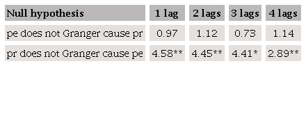 As a more rigorous proof of the causal relationship from pr to pe, we estimate the following long-run equation: