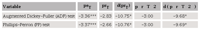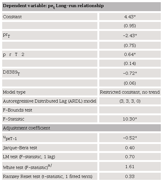 where βi are the parameters to be estimated, T is the time index and upe is an error term. Before estimating the long-run equation [19], we show in Table 3 the unit root test for the time series used. As it can be seen, pe is a stationary series while pr and pr2 are integrated of order 1. To estimate the long-run equation [19], we use the bound test approach (BTA) cointegration methodology (see Pesaran, Shin, and Smith, 2001)5. The results of our estimation are shown in Table 4.