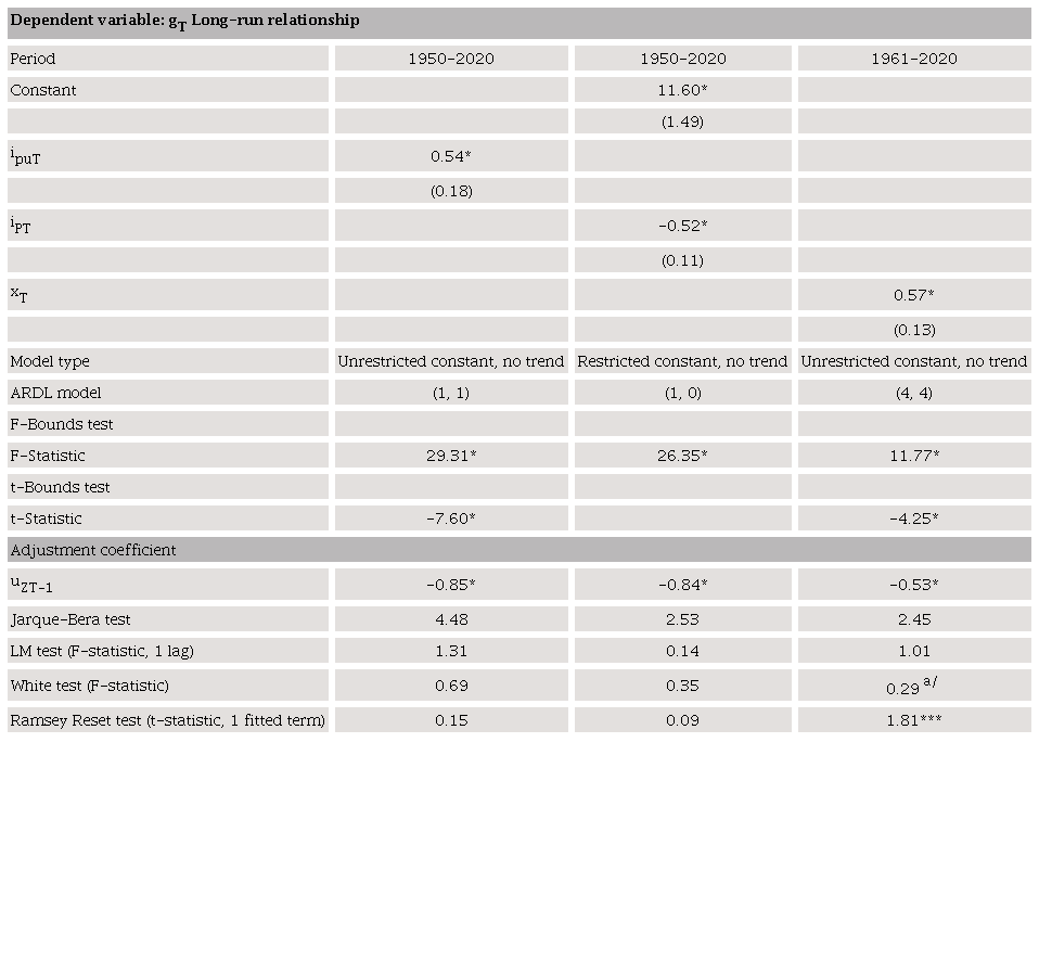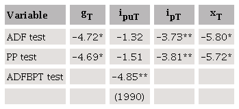 where θi are the parameters to be estimated, Z is an independent variable [we use three different candidates: Ipu and Ip as a percentage of GDP (ipu and ip respectively) and the exports growth rate (x)], and uZ is an error term. Before estimating the long-run equation [20], Table 5 shows the unit root test for the time series used. As shown, all the variables are stationary. To estimate the long-run equation [20], we use the BTA cointegration methodology7. The results of our estimation are shown in Table 6.