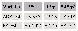 where αi are the parameters to be estimated, nx and pc are NX and PC as a percentage of GDP, respectively, and unx is an error term. Before estimating the long-run equation [21], Table 7 shows the unit root test for the time series used. As shown, all the series are stationary. Finally, using the BTA cointegration methodology8, our estimation results of the long-run equation [21] are shown in Table 8.