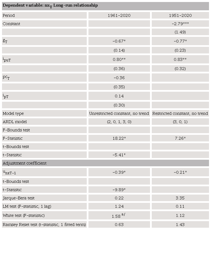Moreover, as indicated above, the reduction of Ipu implies a negative effect on NX, causing the balance of payments constraint to become stronger. To show the positive effect of Ipu on NX, we estimate the following long-run equation: