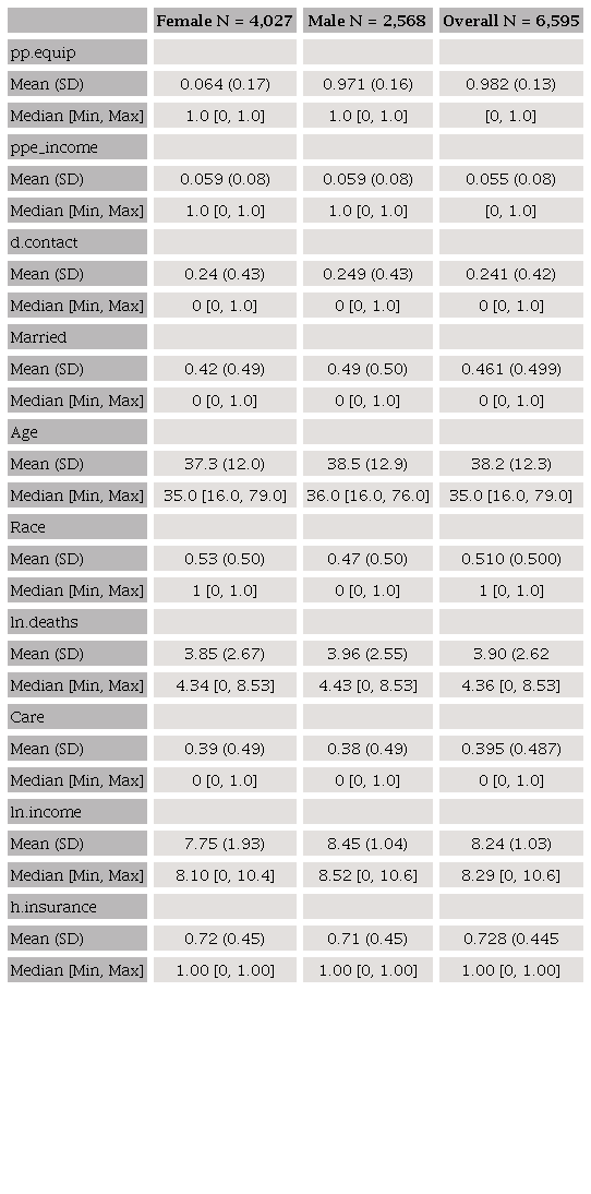 There were 1,193 responses obtained from 24 Brazilian states, with different proportions in the number of respondents. After cleaning the data, removing the observations from respondents under 18 years, and with inadequate filling, the sample reduced to 1,151 observations. Of the responses, 447 were complete observations (respondents answered all questions), and 704 observations had at least one missing value. Due to number of missing values, we decided to run a Multivariate Imputation via Chained Equations by MICE package of R Programming following Buuren and Groothuis-Oudshoorn (2011) instructions. We chose to create only 5 (m = 5) imputed datasets, yielding six datasets overall. After running the MICE package, we achieved 6,907 observations. After inserting the following conditions (Age > 16, income > 0 and income > PPE spends) we obtained 6,595 observations. The Table 1 reports summary statistics on the data employed in econometric model presented in section 2.