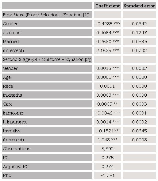 The error term for ρ(rho) is -1.781, meaning that the unobserved factors that motivate purchases are negatively correlated with one another. For the second stage, the goodness-of-fit statistic -R2- is 0.275. The parameter estimates and the associated p-values are exhibited in Table 1. The variable Invmills (Inverse Mills Ratio) is statistically significant at the 0.01 level (-0.1521), indicating evidence of sample selection bias. In other words, whether or not spending on protection is not random. About the average spending on PPE was $ 31.41, while the average income was $1,052. Overall, respondents spent approximately 3% of their monthly income on protective equipment against SARS-COV-2.