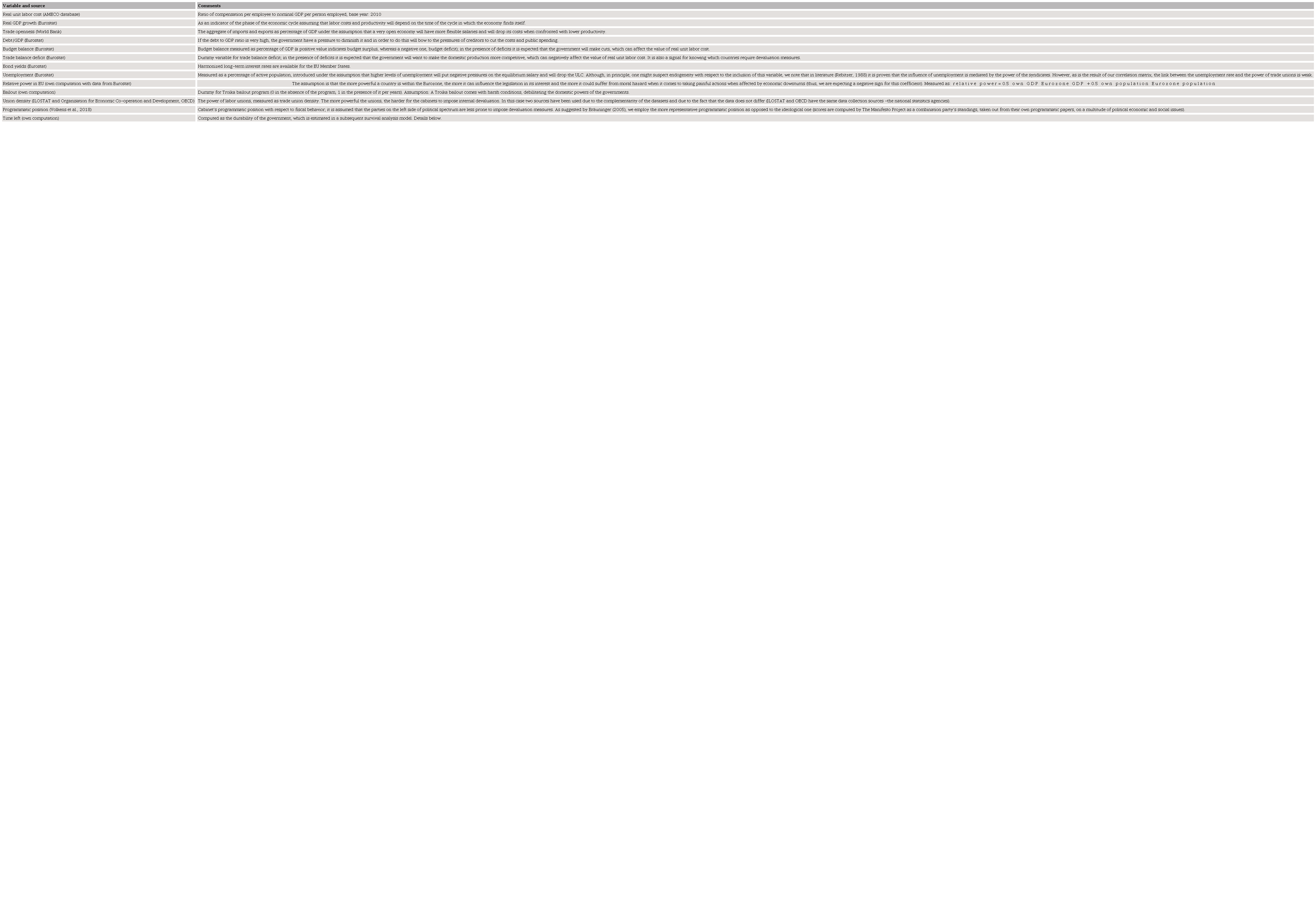 In order to be able to check which is the better predictor for the imposition of internal devaluation measures in Eurozone, we propose a panel data model in which the real unit labor cost is considered as the dependent variables and where the expected time in office (as postulated by the parties in power opportunistic and strategic thinking hypothesis) and bond yields on long-term government debt (as postulated by the financial markets signals hypothesis) are the main independent ones. Besides the three already mentioned variables, we also include several relevant control variables; more details in this respect are provided in Table 1, where the rationales for choosing them, their sources and their expected relationships are specified.