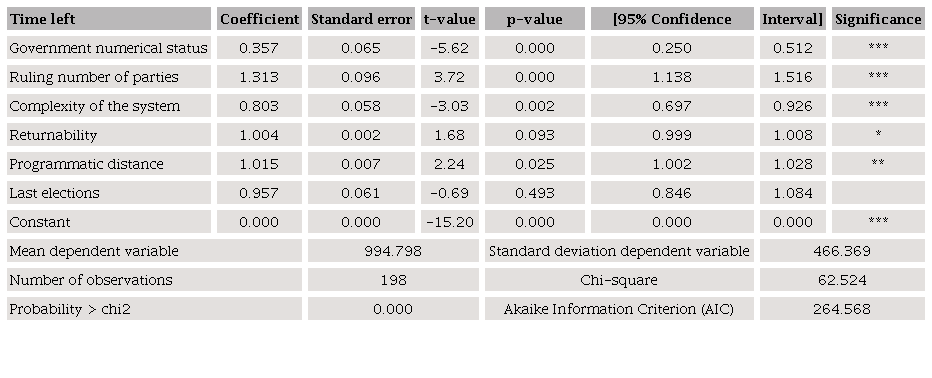 It is quite difficult for the cabinets to know ex ante their survival time in power when facing the imposition of unpopular measures. Still, one can intuitively and correctly assume that their duration will depend on some political factors such as holding majority in legislative, the degree of fragmentation of the parliament or the ideological/programmatic distance between the members of the coalition, just to name a few. Based on this idea, there is a whole body of literature which developed since the 80s in political science (Lupia and Strøm, 1995; Warwick, 1995; Merlo, 1997; Diermeier and Stevenson, 1999; Laver, 2003; Chiba, Martin and Stevenson, 2015) which tried to find the best predictors of cabinet durability using a methodology borrowed from health sciences: Survival analysis. In order to produce these estimated times in office for each government, we employed a survival analysis model with a Weibull parametric regression (as opposed to a competing semiparametric Cox regression). Furthermore, it is also wrong for the purposes of our work to make a distinction between governments that end in dissolution and dismissal (as suggested by Diermeier and Stevenson, 1999), because there is no credible way in which a cabinet will know a priori how it will end. The regression output will be represented by hazard rates which have the following mathematical expression: