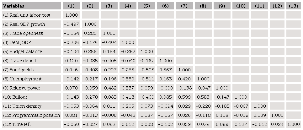 The exposition of these results is merely indicative and it is meant to provide us with a certain guarantee that the survival analysis estimation is done correctly, because, for the purposes of this study, it must be used later for the main model. Concretely, we employ the estimates of the survival analysis model, subtract from them the Cox-Snell residuals (as suggested in Zhao et al., 2011) and interpret them as if they were the expected time in office for each cabinet in our sample. For the main model variables, we employed a correlation matrix, presented in Table 3. As noted, none of the independent variables’ pairs have correlation coefficients above ±0.8, which implies that there are no multicollinearity issues in our model. At first, only checking the relations from Table 3, it seems that there is a positive association between unit labor costs and the bond yields and a negative one with cabinet durability, thing that could validate the strategic thinking and opportunistic behavior hypothesis, although the coefficients are very weak in both cases, and as a consequence we cannot infer on this association. The positive, albeit low correlation coefficient between time left and debt/GDP, could at first sight indicate that longer mandates are correlated with increased debt levels; however, we refute this hypothesis on two counts: 1) the relationship is very weak, and 2) it might just be a spurious one, driven by the increases in debt levels all over Europe in the period under consideration and because there might be the case that longer coalition (and more polarized) governments (very common in Europe) have a more deficit biased behavior as indicated by empirical findings (Alesina and Tabellini, 1990).