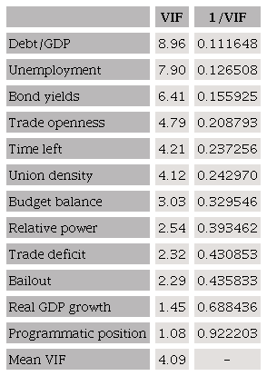 where Controlit are the control variables indicated above, in Table 1, Timeleftit is the expected time left in office for the cabinets and Yieldsit are the long-term interest rates for governments debt; in the case of governments that survived for different years, we discounted the days spent in office from the beginning of each year in the sample. The αi indicates the unobserved heterogeneity and Uit is the idiosyncratic error. We also performed a Hausman test, which indicated the appropriateness of fixed rather than random effects or pooled ordinary least squares (OLS). Our post-estimation robustness check includes a Variance Inflation Factor (VIF) test (we tested the remaining variables for multicollinearity problems and eliminated those that had a VIF higher than 10). Under the assumption that the government have real-time indications and forecasts on some variables (so it based its strategy on current information) and due to a higher level of determination, we decided to employ a concurrent model as opposed to a lagged model.