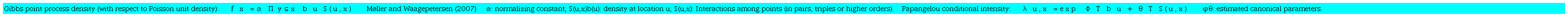 Because of the normalizing constant a, it is difficult to work directly with the density and the model is made tractable by working instead with the Papangelou conditional intensity function, which is the probability of observing a point u of the process in a small neighborhood du of u, conditional upon the rest of the process X. Because of the exponential form of the Gibbs model, standard software implementations for generalized linear (additive) models can be used to estimate parameters of the conditional intensity function.