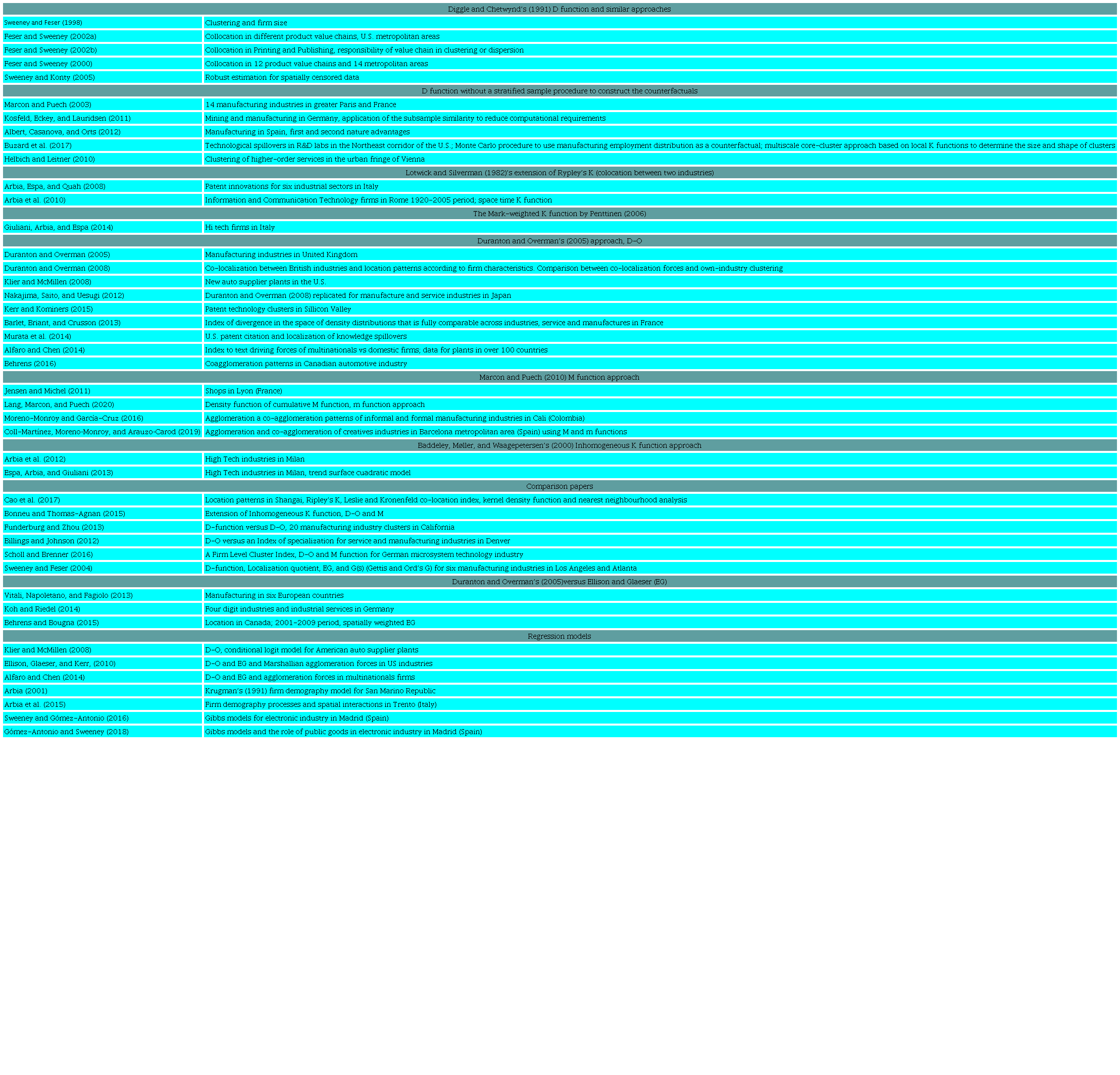 The first to introduce these techniques to examine clustering of manufacturers was Barff (1987), who implemented Ripley’s K function for the Cincinnati metropolitan area. A limitation of this analysis is that the null hypothesis is a completely random spatial distribution of establishments. Case-control methodologies were developed to avoid this assumption. Review of empirical application allows to determine the impact of each methodology, and to highlight how substantial recent research has focused on developing new methods or extensions, mainly under the case-control strategy. Besides, it shows that the literature is orphan in order to identify the determinants of industrial clusters and how certain papers cover this drawback by estimating area-based linear regression models. Finally, we hope it is helpful in order to guide and attract new researchers to this field.