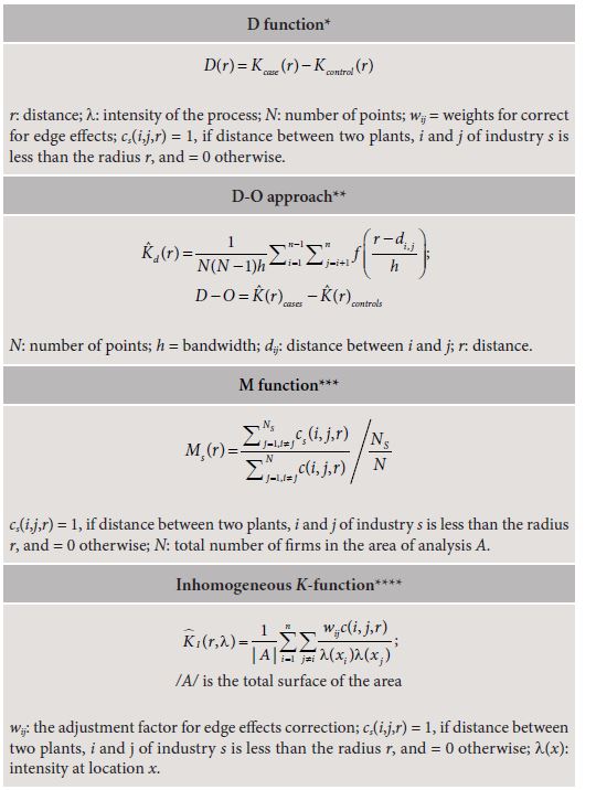 These approaches, either explicitly or implicitly, aim to distinguish join localization from colocation (first-order from second-order concentration). To isolate the potential factors determining concentration, several papers analyzed different subgroups of firms according to their characteristics, others considered the dynamic dimension, proposed new cumulative or density counterpart functions, or extended the Inhomogeneous K function approach to marked weighted patterns. Recently, several papers have estimated linear regression models of distance-based indexes on covariates to explicitly identify industrial cluster determinants.