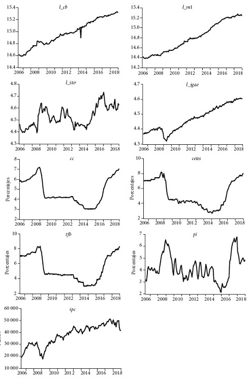 El vector Yt de la ecuación [2] se compone de las siguientes variables: l_cb, cetes, ipc, pi, cc, tfb, l_itcr, l_IGAE y l_m1, donde l indica el logaritmo de la variable; obtuvimos l_cb y l_m1 a partir de series desestacionalizadas en millones de pesos. La periodicidad de las variables es mensual, de junio de 2006 a diciembre de 2018 (base julio de 2018 = 100). Las variables l_m1, l_itcr, tfb y pi se obtuvieron del Sistema de Información Económica del Banco de México (Banxico, 2019); las otras variables se consiguieron del INEGI (2019a y 2019b).