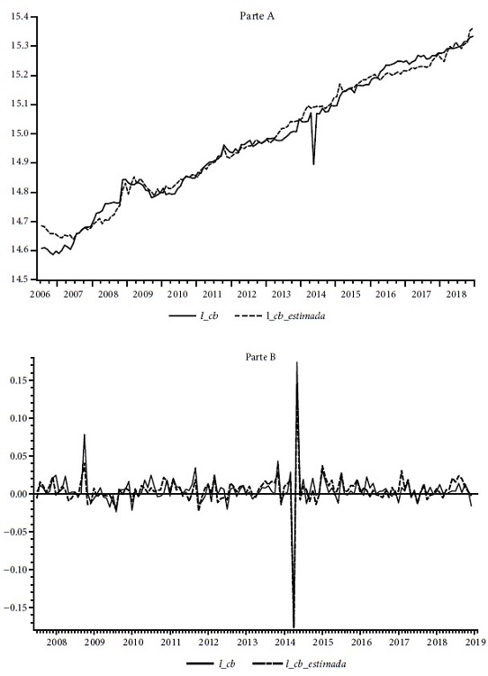 A pesar de los problemas de especificación, el MCE uniecuacional se ajusta razonablemente bien (R2 = 0.827 y R2 ajustado de 0.794); en la Gráfica 2 parte B mostramos el ajuste, graficamos la primera diferencia de la captación bancaria estimada (Δl_cb_estimada) junto con los datos observados (Δl_cb).