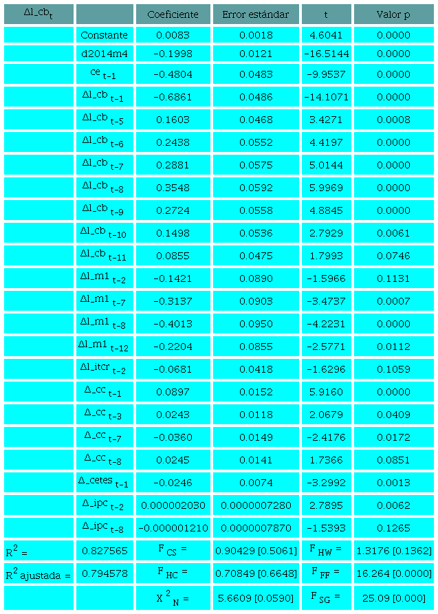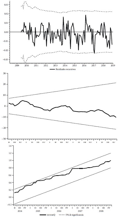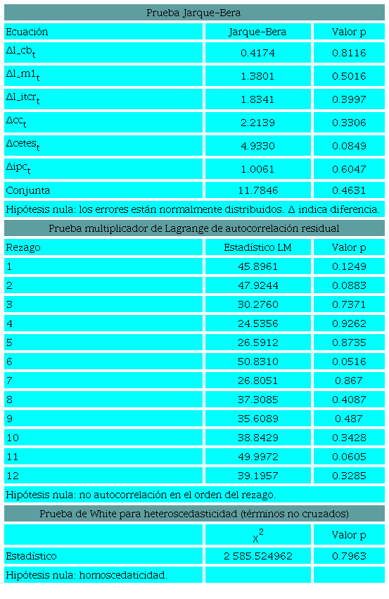 Después de introducir las variables dummy, la prueba Jarque-Bera indicó normalidad en los residuos. No se presentaron problemas de autocorrelación ni heteroscedasticidad (el Cuadro 2 muestra las respectivas pruebas). La siguiente ecuación representa el MCE: