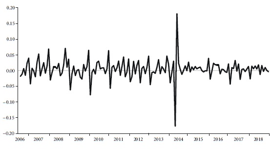 Agregamos dos variables dummy, d2008m10 y d2014m4, dado que en 2008 ocurrió la mayor crisis financiera desde 1929 (Marichal, 2010) y en 2014 comenzó la caída en el precio del barril del petróleo, desde más de 100 dólares hasta 30 dólares a comienzos de 2016 (Daicz y Monlezún, 2016), lo cual afectó a la industria petrolera y a los bancos que las financian.