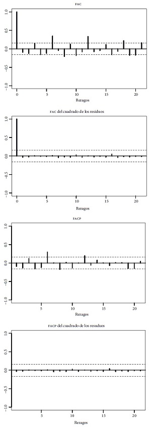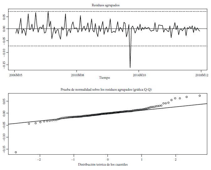 Las Gráficas 5 y 6 muestran la información de los residuos agrupados; la Gráfica 5 presenta los correlogramas de las funciones de autocorrelación y autocorrelación parcial y del cuadrado de los residuos; se aprecia que no existe dependencia serial en los residuos; la Gráfica 6 contiene los residuos agrupados, sobresale el outlier de 2014, de ahí que la gráfica Q-Q sugiera que la hipótesis de normalidad es ligeramente cuestionable.