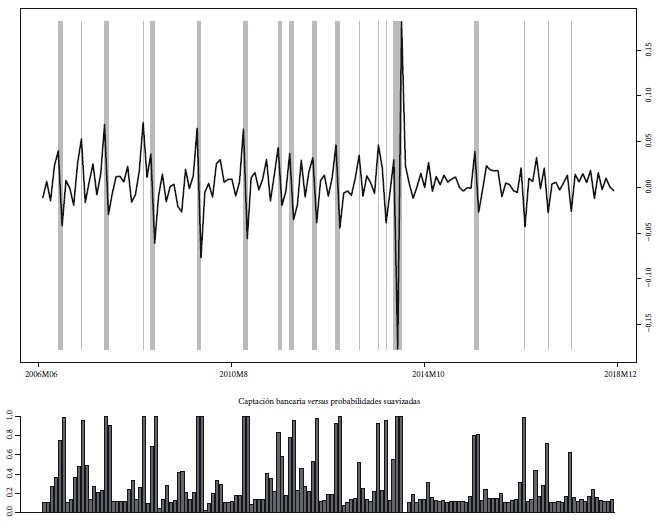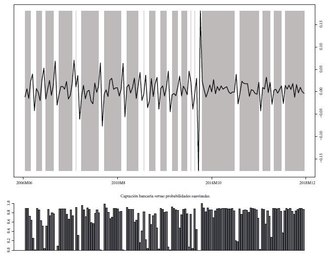 La Gráfica 7 reporta los resultados de las PRF; se aprecia que el modelo estimado captura la característica dominante de la tasa de crecimiento de la captación bancaria, la clara presencia de dos regímenes; la durabilidad del segundo aumenta aún más a partir de 2014.