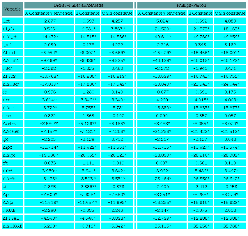 La Gráfica 1 presenta estas variables, algunas muestran tendencias, lo cual sugiere no estacionariedad. Por lo tanto, iniciamos averiguando su orden de integración. El Cuadro 1 muestra las pruebas Dickey y Fuller (1981) y Phillips y Perron (1988); concluimos que las variables son no estacionarias, de orden de integración 1, simbólicamente I(1).