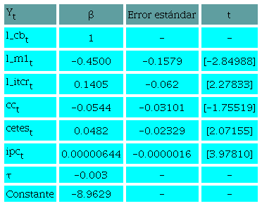 El Cuadro 3 muestra el contenido de β, es decir, los coeficientes normalizados de la relación de cointegración. Esta relación de largo plazo puede representarse así: