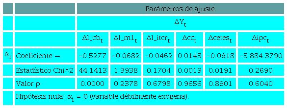 En lo concerniente a la exogeneidad débil, el Cuadro 4 muestra los coeficientes de α (los parámetros que controlan la tasa de ajuste al desequilibrio). La prueba de exogeneidad débil establece restricciones al vector α, la restricción H0: αi = 0 (variable débilmente exógena), se presenta en el Cuadro 4. Usando el valor p, sólo se rechaza αl_cb = 0. Ello significa que únicamente el logaritmo de la captación bancaria hace todo el ajuste (sólo esta variable reacciona en el corto plazo para restablecer el equilibrio). Así, formalizamos la endogeneidad de l_cb y la exogeneidad débil del resto de las variables, lo cual plantea que el MCE se represente de manera uniecuacional.