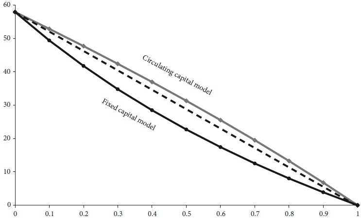 The intuition behind the above relation is that if x and s are no different from each other it follows that the nearly straight lines in WRP curves may be attributed to the standard output, as shown in relation [7]. In similar fashion if lʹ- πʹ are nearly equal, it follows labor values and prices of production are no different from each other or, what is the same, the capital intensities are the same across industries.