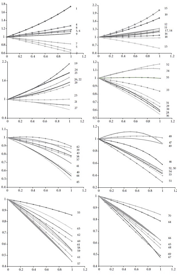Figure 2 below displays the price trajectories of industries of each and every of our 70 industries for the year 2012 in the circulating capital model4. Hence, we employed equation [8)] and for 0 ≤ ρ < 1 we generated the PP paths relative to DP by applying an element-by-element division of the two vectors for each particular ρ.