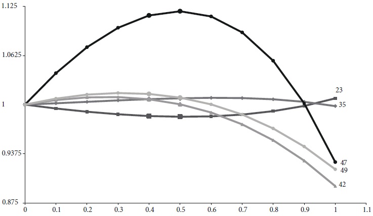 In fact, three industries (23, 35 and 47) cross the line of ones at a relative rate of profit nearly equal or higher than 90%. The other two occurences of crossing still take place at relative rates of profit twice or three times higher than the equilibrium relative rate of profit of 18.8%. Finally, we observe that as the relative rate of profit takes on higher and higher values, the trajectories of PP remain near their DP with a maximum deviation of only 12%. The variability of these PP as measured by their standard deviation with “regular” behavior is the least of all the other industries5.