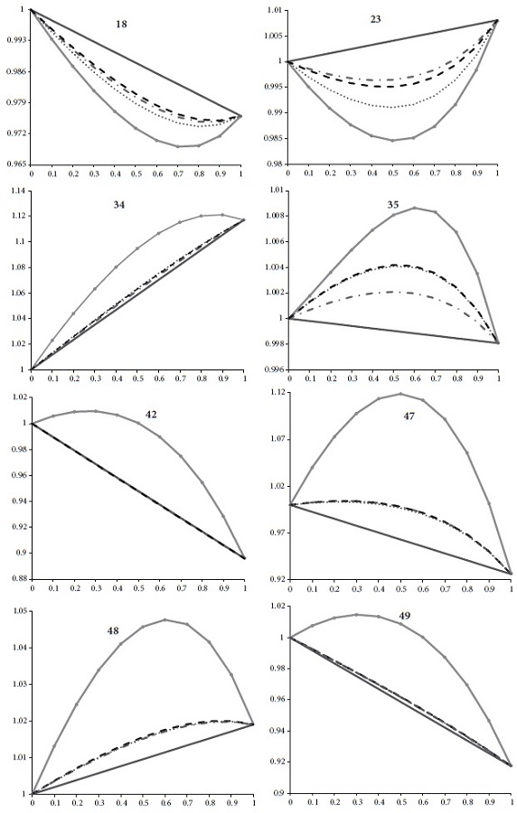 In experimenting with the US data of the year 2012 we found that the results derived using the matrix H1 are quite good. Clearly, the two price trajectories of an industry estimated from H1 and H coincide at ρ = 0, where the relative PP of the two matrices are equal to each other and to the DP. As ρ increases, the two estimates of relative PP depart from both the DP and themselves moving, in most cases, to the same direction; at the end, that is, when ρ gets to its maximum, the two estimates, that is, the actual relative PP of each and every industry and their respective approximations tend to become equal. In Figure 4 below we display in a panel of eight graphs the trajectories of prices of production of eight industries with their linear and nonlinear approximations. The MAD is displayed on the vertical axis and the ρ is on the horizontal. The eight industries are the ones that display extrema (maximum or minimum points) and, therefore, with the highest curvatures and, at the same time, the lowest variability as measured by their standard deviation. The remaining industries with the higher variability display linearities and so their approximation by higher order terms does not have much to offer.