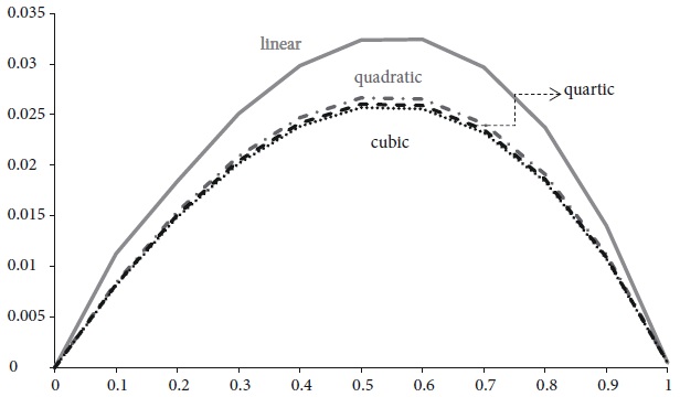 In Figure 5 below, we present estimates of the MAD (vertical axis) between the price trajectories of all our industries and their respective approximations; namely, linear, quadratic, cubic and quartic. The error in each approximation is maximized in the middle range of relative rates of profit shown on the horizontal axis. At ρ = 0.60, the MAD of the linear approximation is 3.243% while at ρ = 0.5 the MAD is slightly lower at 3.236%; of course, the MAD at the start and end points of the curves is zero.