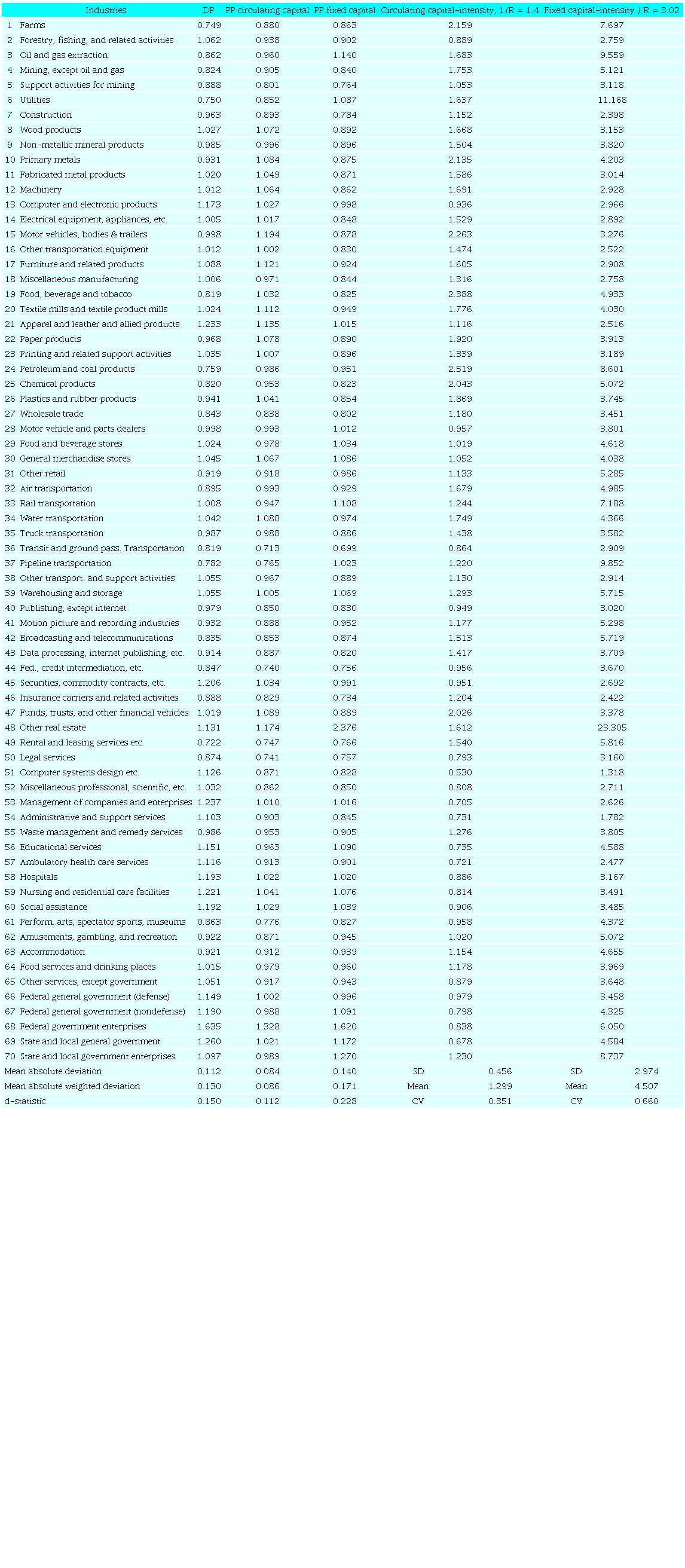 Before we start with the plotting of trajectories of PP relative to DP, it is important to show the proximity of DP and PP to each other and to MP using both circulating and fixed capital models and also the respective industry capital-intensities relative to the standard ratios and the related statistics of dispersion. Thus, the first column in Table 1 below presents the DP while the next two columns present the PP for the circulating and fixed capital models, respectively. The Mean Absolute Deviation (MAD) computed as the mean value market of the absolute difference of estimated prices relative to MP, which by definition are equal to one million dollars’ worth of output (see Miller and Blair, 2009, ch. 2) and so the MP are equal to the row (1×70) vector of ones. The Mean Absolute Weighted Deviation (MAWD) multiplies the row vector of the absolute differences of the two prices relative to MP times the column vector of each industry’s share in total output. In the same spirit and independent of the chosen numéraire the , where the cosine of ϑ is derived from the arcsine of the tangent of the two in comparison vectors estimated by their coefficient of variation. All statistics show reasonable deviations supportive of the proximity of the estimated prices from the MP (Mariolis and Tsoulfidis, 2010, 2016a and the literature cited there).