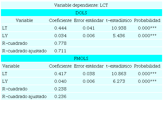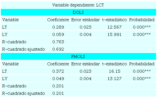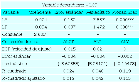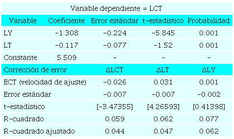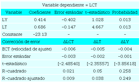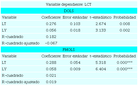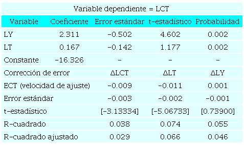 Las estimaciones de los vectores de largo plazo DOLS y FMOLS, descritos en el Cuadro 9, muestran que cuando LT incrementa en 1%, el LCT aumenta 0.276% y 0.288% respectivamente, mientras que si LY se eleva 1% entonces LCT crecerá 0.056% y 0.058%.