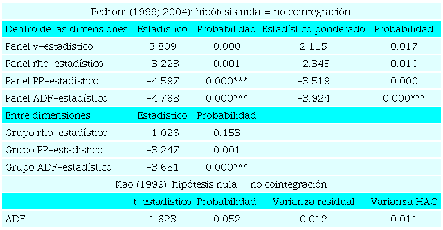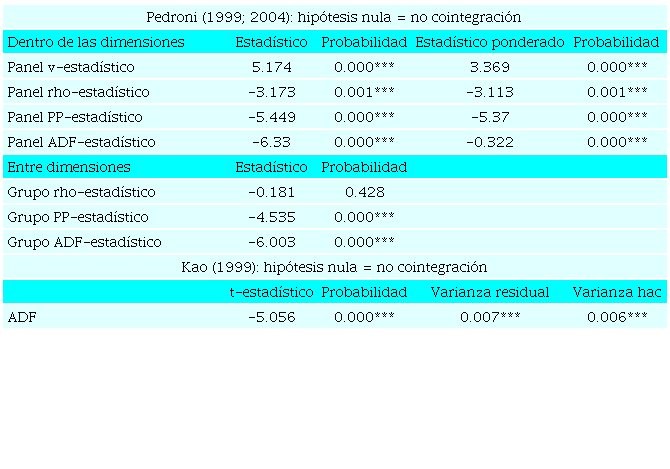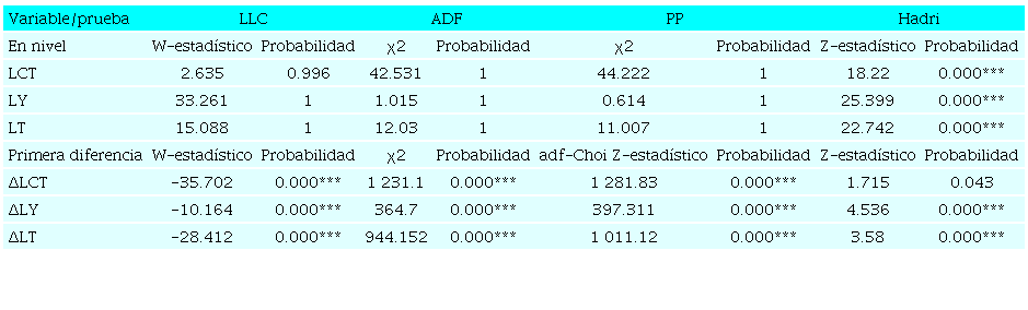 donde L denota el logaritmo neperiano de cada una de las variables que conforman la ecuación [1], (0 es la constante, (1 y (2 son los coeficientes que miden la sensibilidad de las variables explicativas y (it es el término de error. Con base en la especificación de la ecuación [2], es posible hacer un análisis de cointegración de datos panel, el cual requiere de la comprobación de la existencia de raíz unitaria para las variables en nivel. Para ello utilizamos las pruebas Levin, Lin y Chu (2002, en adelante LLC), Chi-cuadrada de Fisher ADF y PP y Hadri (2000). Asimismo, la existencia de cointegración la comprobamos con las pruebas de Pedroni (1999; 2004) y Kao (1999) basadas en Engle y Granger (1987) y en el método multivariado de Johansen (1988; 1994). El vector de largo plazo se obtiene estimando el MCO dinámico (DOLS, Dynamic Ordinary Least Squares) y el MCO totalmente modificado (FMOLS, Fully Modified Ordinary Least Squares) [Kao y Chiang, 2001; Pedroni, 2001]. El modelo ajustado de corto y largo plazo lo obtenemos mediante el vector de corrección de error para panel de datos (VECM, Vector Error Correction Model) [Westerlund, 2007]. Las estimaciones se realizaron con el programa econométrico Eviews 11.