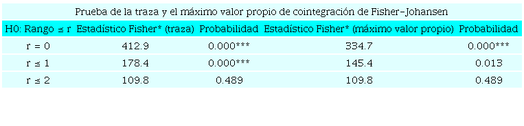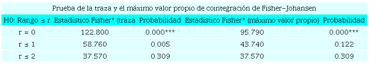 En el Cuadro 8 demostramos la existencia de al menos dos vectores de cointegración dadas las probabilidades significativas tanto de la prueba de traza como de la de máximo valor propio de la prueba Fisher-Johansen.