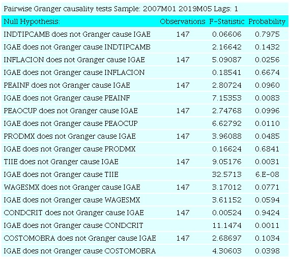 Pruebas de Causalidad de Granger. Una variable X Granger causa Y si los cambios pasados de X podrían ayudar a predecir los cambios actuales de Y. Si X Granger causa Y y no al revés, se llama causalidad unidireccional. Si X Granger causa Y e Y también Granger causa X, se diría que existe una causalidad bidireccional entre ellas. La prueba de causalidad Granger se realizó para determinar la dirección de la causalidad entre las variables de estudio. En resumen, los resultados muestran que la variable IGAE es causada en el sentido de Granger por las variables independientes, pero hay causalidad bidireccional entre la variable IGAE con las variables PEA formal e informal, y con la variable salarios.