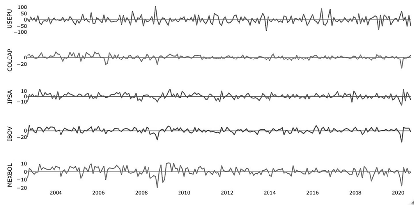 This research considers a sample of four of the major Latin American Countries (LAC): Chile, Brazil, Mexico and Colombia. Hence, the database consists of four series of stock market indexes: Chile’s IPSA (Índice de Precios Selectivo de Acciones) index, Brazil’s IBOV (abbreviated name of IBOVESPA, Índice da Bolsa de Valores de São Paulo) index, Mexico’s MEXBOL (Mexican Bolsa) index and Colombia’s COLCAP (Colombia Capital) index, all of them obtained from Bloomberg for the period 08/01/2002-8/1/2020, which gives a total of 217 monthly observations for each index. On the other hand, the USEPU is obtained from the website of Economic Policy Uncertainty Index (EPUI) and generated in accordance to the methodology proposed by Baker et al. (2016)2. The five series are transformed into logarithmic growth rates, or logarithmic returns, given by (In (pt ) - In (pt-1 )) × 100. Figure 1 shows all series as growth rates.
