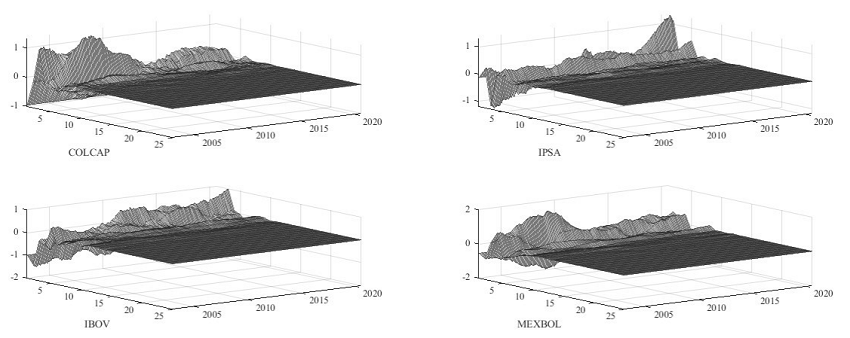 This section presents the results from the IRFs and surfaces of irfs over time. Figure 2 shows the IRFs results of a shock from the USEPU to the four stock market returns of the LAC under study. A USEPU shock initially affects the stock market returns in a negative manner and, subsequently, the effect becomes positive reaching its maximum level around the third period (three months) for the cases of the IPSA, IBOV and MEXBOL. The same is true for the COLCAP but on a smaller scale. The effects of the USEPU shock dissipates completely around period twenty for COLCAP, IPSA, and IBOV, and around period twenty-three for the Mexican stock market (almost two years in all cases). These results show the impacts of USEPU and how they are transmitted over time to stock markets in lac. Moreover, Figure 3 shows the IRFs over time, or time-varying IRFs, of a shock from USEPU: On the axis of the horizontal plane in Figure 3 the years 2005, 2010, 2015 and 2020 are shown; the irfs are shown over time. It is observed, as time passes, that the effect of the shock is similar in all the indices, although the magnitude of the shocks for IPSA and IBOV are greater in the initial periods of 2002-2010 while for COLCAP and MEXBOL are greater in the initial periods of 2011-2020. Finally, the scale for the COLCAP is lower compared with the other three indexes. The results show how a USEPU shock to lac stock market returns first appears and then turns positive with different magnitudes and durations. This could have been considered by economic agents as an investment diversification strategy for the period prior to COVID-19 (Christou et al., 2017).