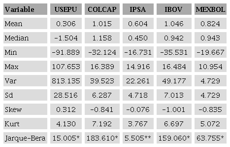 In the last decades, US Economic Policy Uncertainty (USEPU) has been related to the irregular federal immigration policy, the constant risk of prolonged government shutdowns, the quantitative easing (QE) programs and, of course, the subprime mortgages crisis and its short- and long-run side effects. These uncertainty sources have had special impact on economic and financial variables in global markets, and particularly in the emerging ones. More recently, the USEPU has received special attention due in part to the fiscal situation of US government, the uncertain monetary policy, the prevailing consequences of the trade war between US and China, the doubtful energy policy, the need of an integral strategy adjacent to the COVID-19 pandemic, and the course of policy to be followed by the new administration of the federal government. All those events may cause uncertainty outside of US in the behavior of financial markets, and in particular in stock markets (Balli et al., 2017).